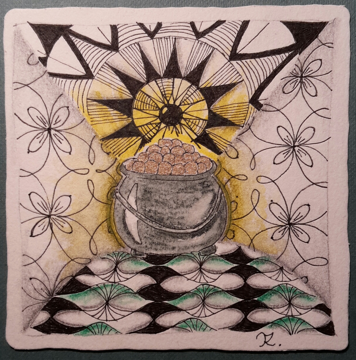 Because it's the Easter weekend Adele gave us a string that looks like a egg for It's a String Thing #137. I love this string and had immediately an idea how to fill it. Because it's Easter and the egg should be a real Easter egg I added a bit of colour to my tile. The patterns we should use are Mel Mel by Adele Bruno, Zenith and Warped Eggs.